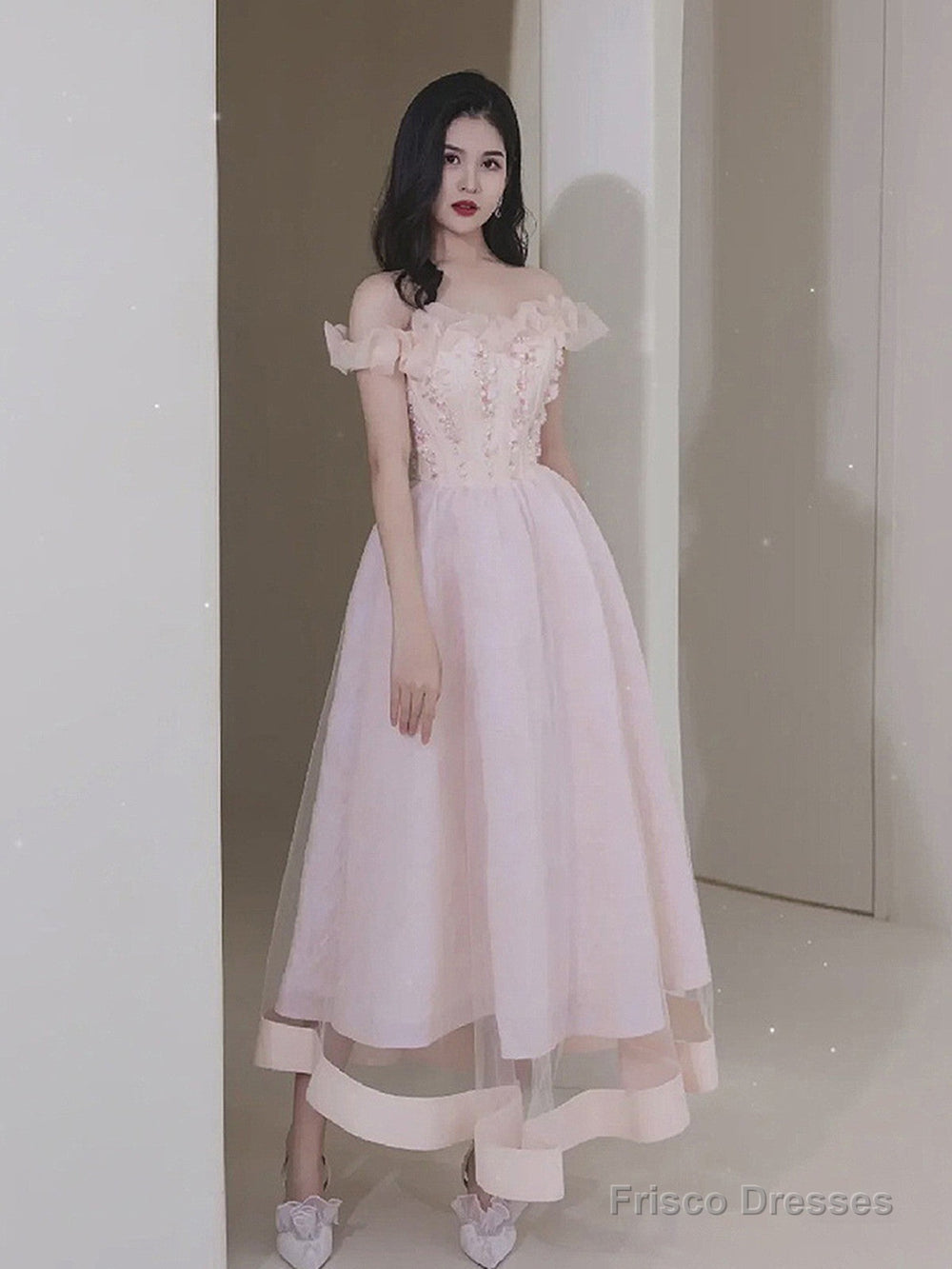 Pink Sweetheart Beaded Tea Length Tulle Homecoming Dress, Pink Tulle Short Prom Dress