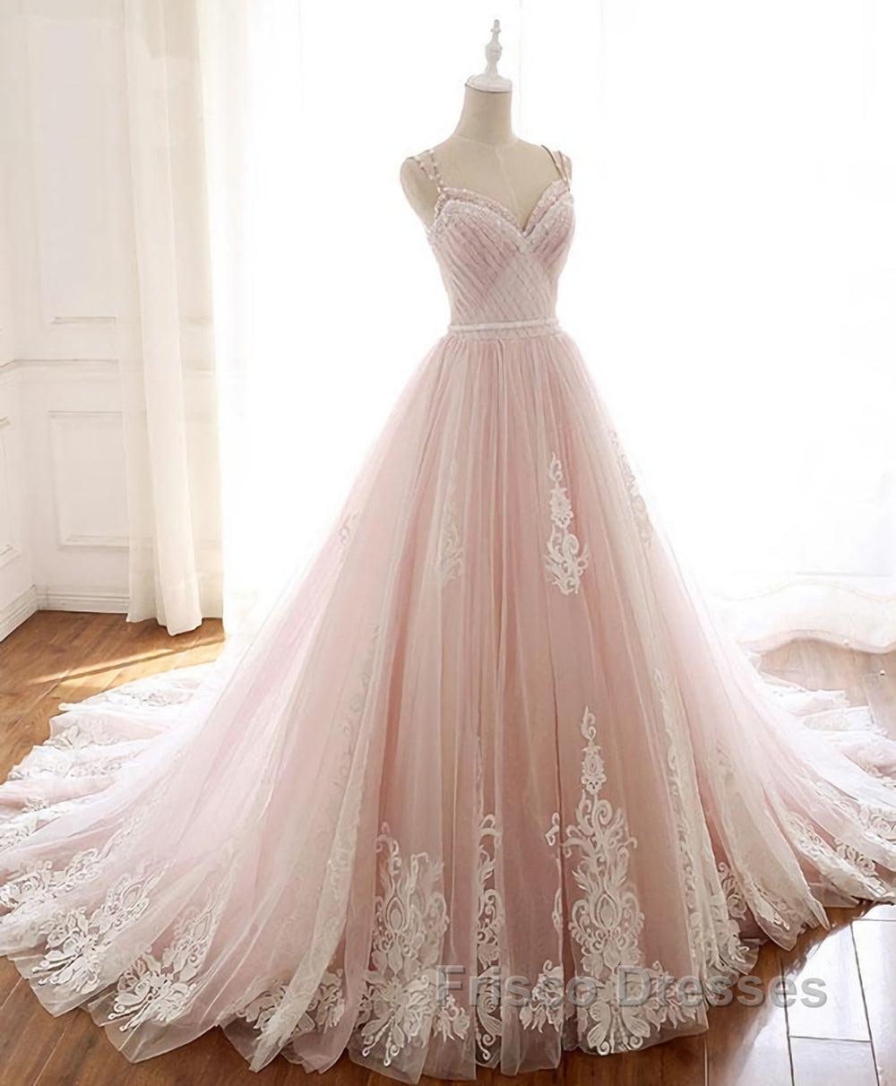 Pink Sweetheart Lace Tulle Long Formal Prom Dress, Lace Pink Evening Dress