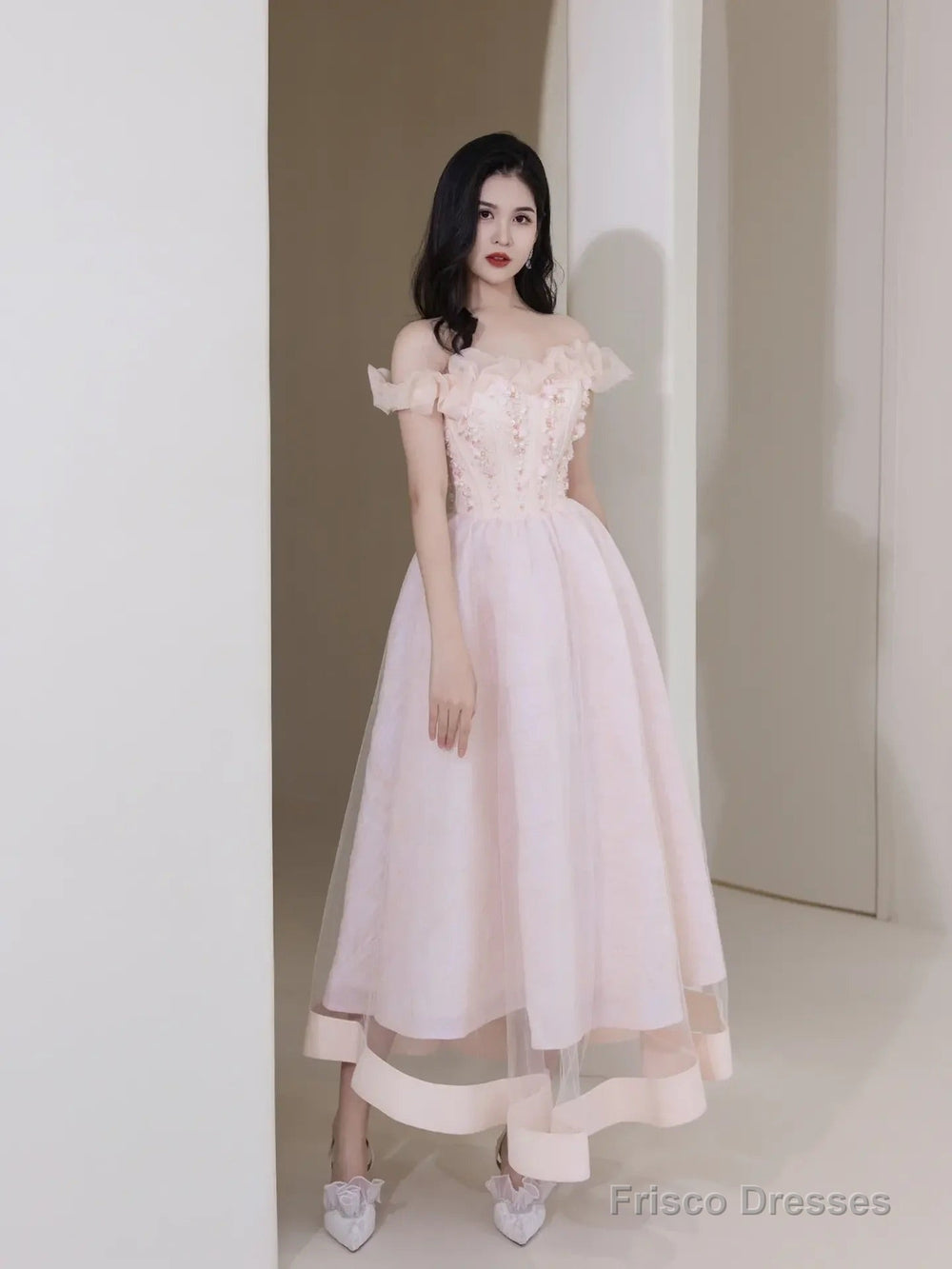 Pink Tulle Beaded Short Prom Dress, Pink Off Shoulder Evening Party Dress
