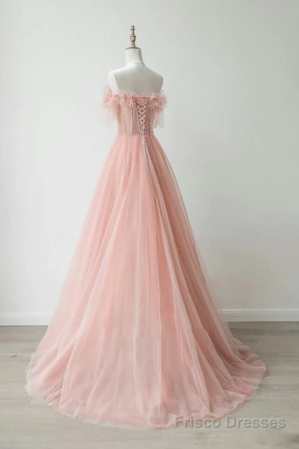 Pink Tulle Strapless Lace Long Prom Dresses, Pink Lace Formal Dresses, Long Pink Evening Dresses
