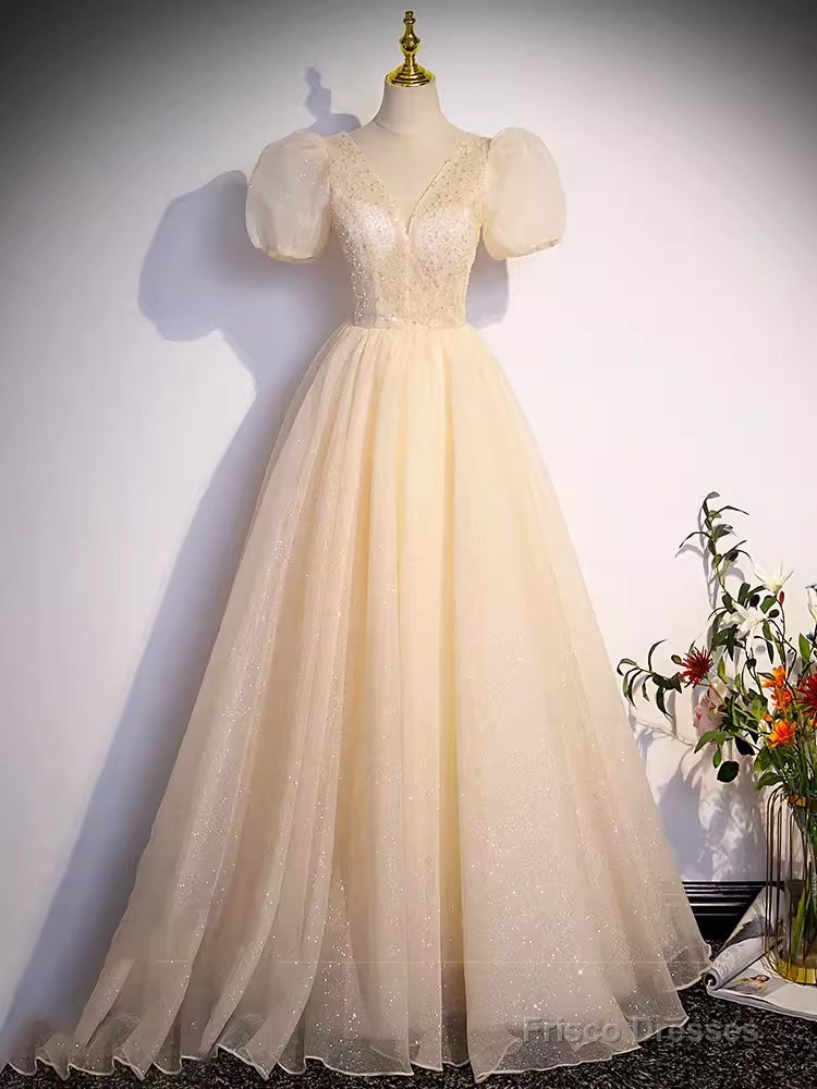 Pretty A Line V Neckline Short Sleeves Long Evening Party Dress Prom Dresses