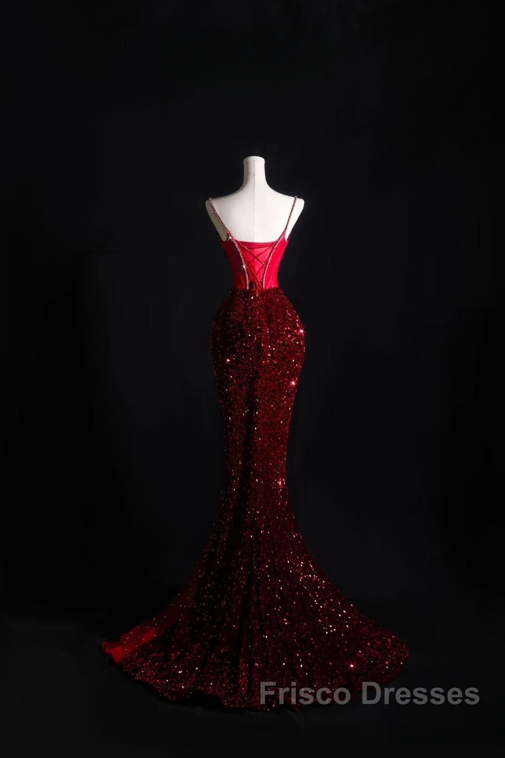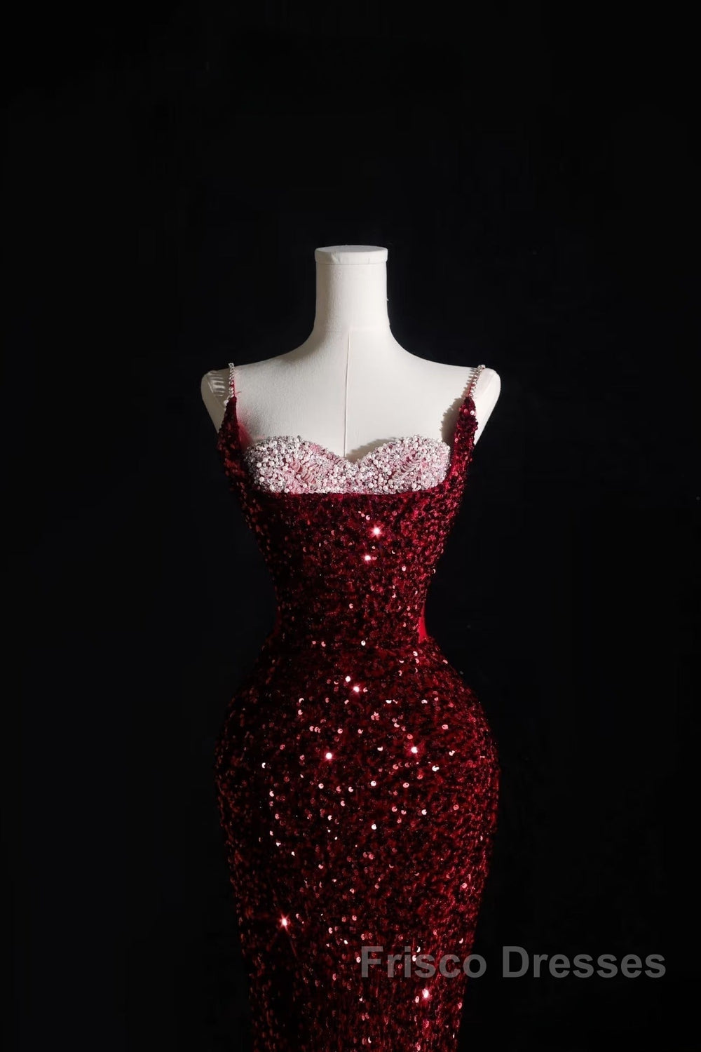Pretty Mermaid Spaghetti Straps Sequin Beads Burgundy Long Formal Prom Dress Formal Evening Dress