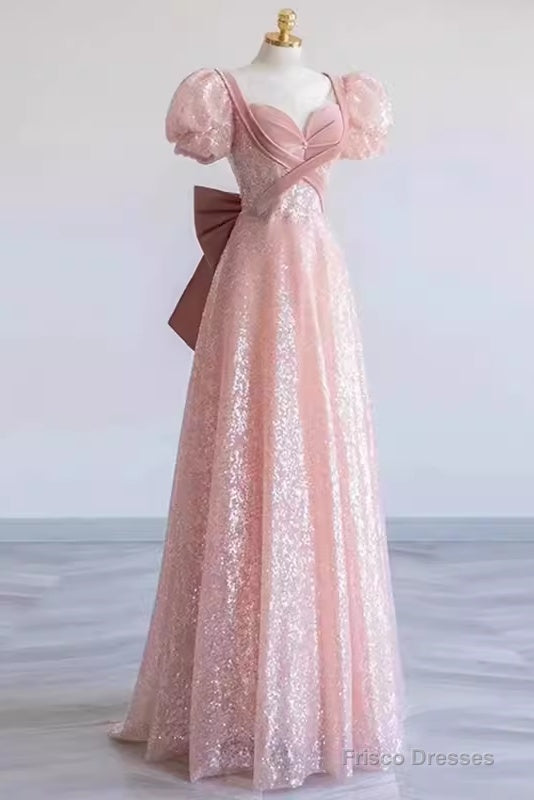 Princess A Line Pink Short Sleeves Sequin Long Prom Dresses