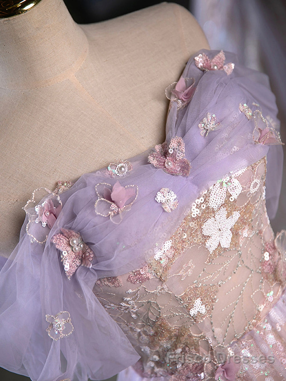 Purple A-Line Off the Shoulder Sequins Prom Dress, Lovely Tulle Corset Floor Length Evening Dress