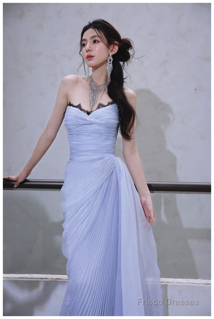 Purple A-Line Strapless Chiffon Pleated Long Prom Dress Chic Lace Graduation Prom Dress