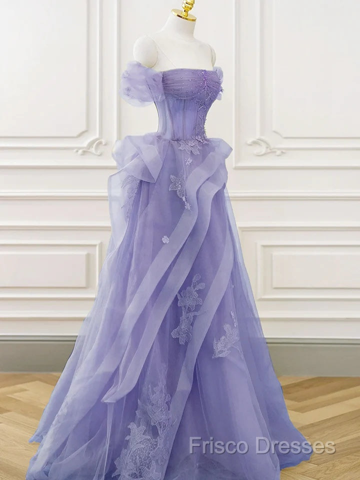 Purple A-Line Tulle Off Shoulder Long Formal Prom Dress, Purple Lace Formal Dress