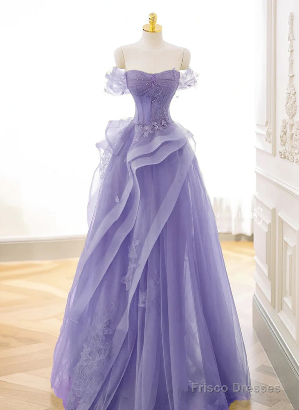 Purple A-Line Tulle Off Shoulder Long Prom Dress, Purple Lace Evening Dress