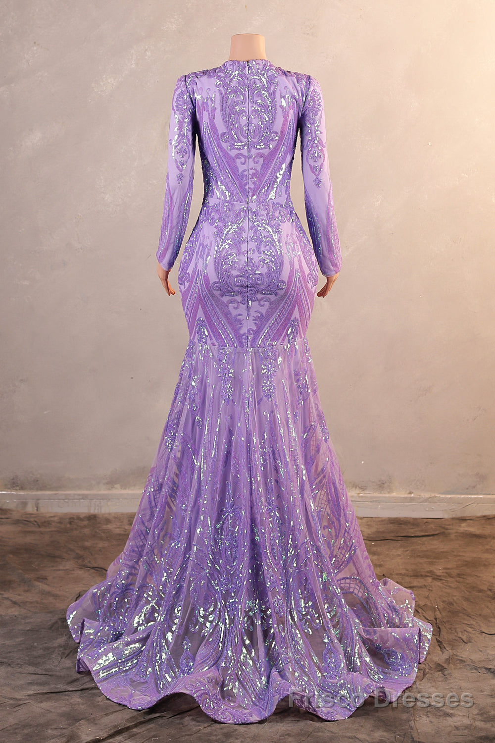Purple Mermaid Prom Dresses Long Sleeves Sequin Long Evening Dresses
