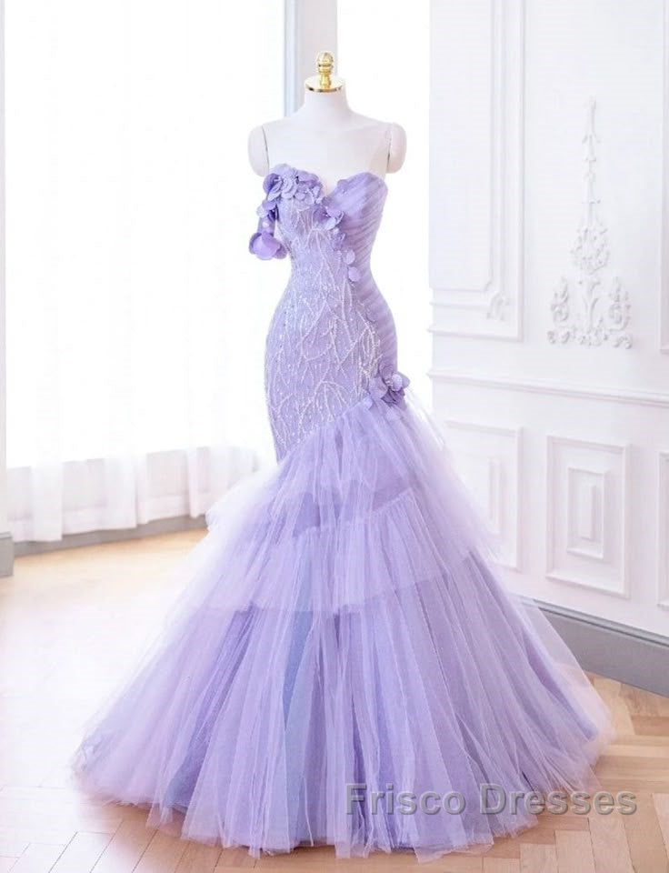 Purple Mermaid Sweetheart Neck Tulle Beaded Long Formal Prom Dress Strapless Sequin Applique Wedding Dress
