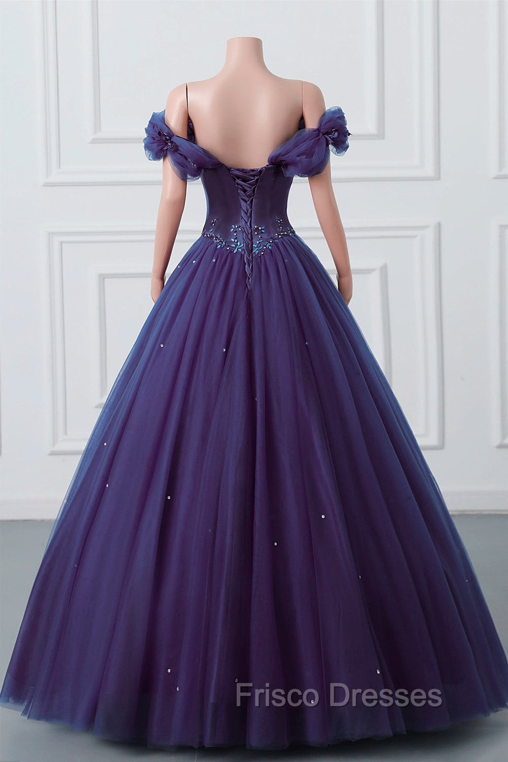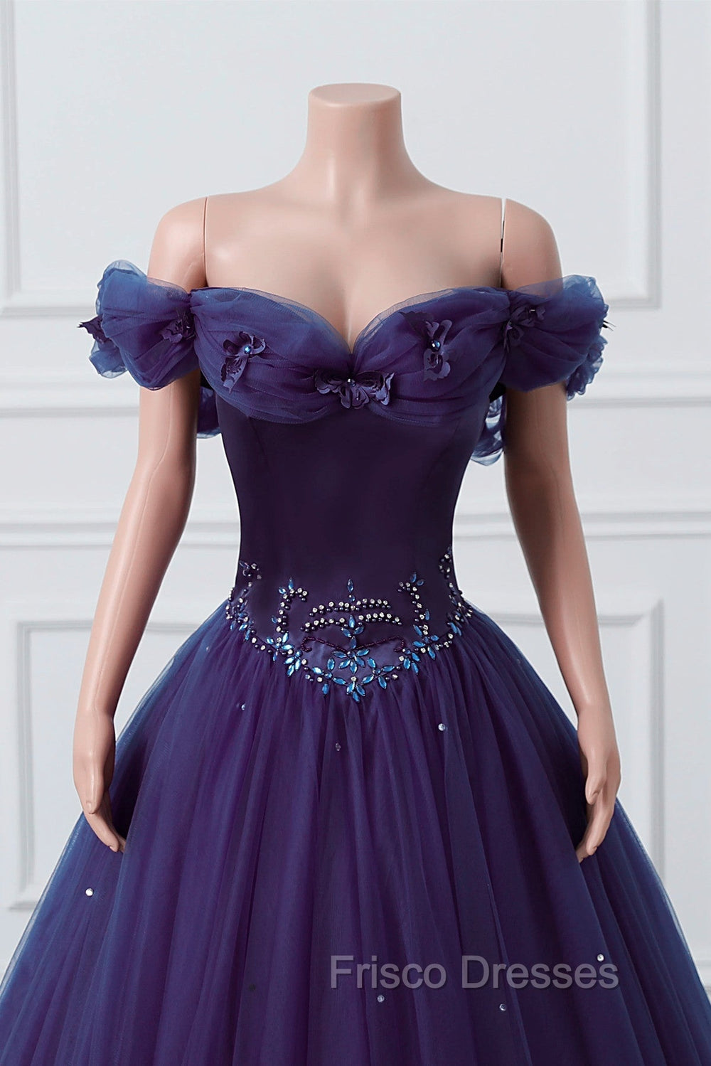 Purple Off-The-Shoulder Sweetheart Party Dress, Beaded Flowers Ball Gown Tulle Formal Prom Dress