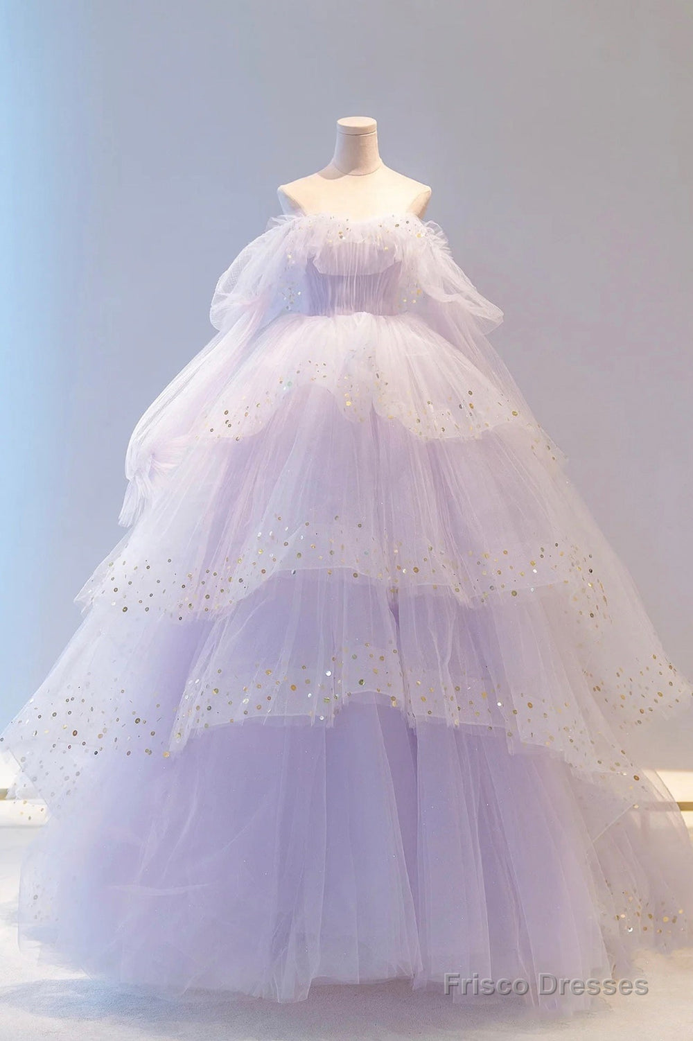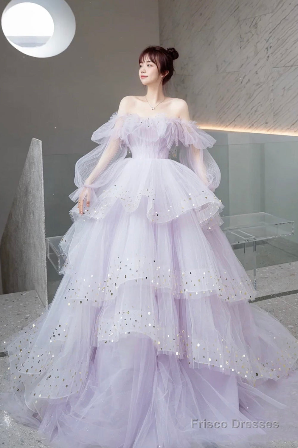 Purple Tulle Layers Long A-Line Prom Dress, Cute Long Sleeve Evening Gown