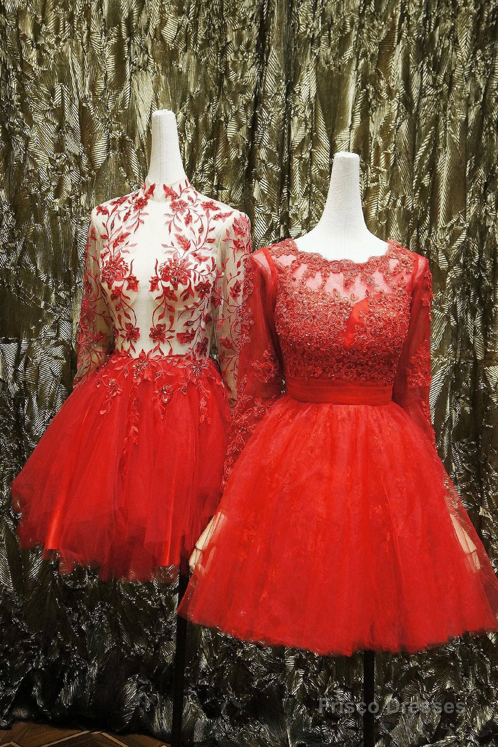 Red Lace Long Prom Dress Red Tulle Lace Short Prom Dress