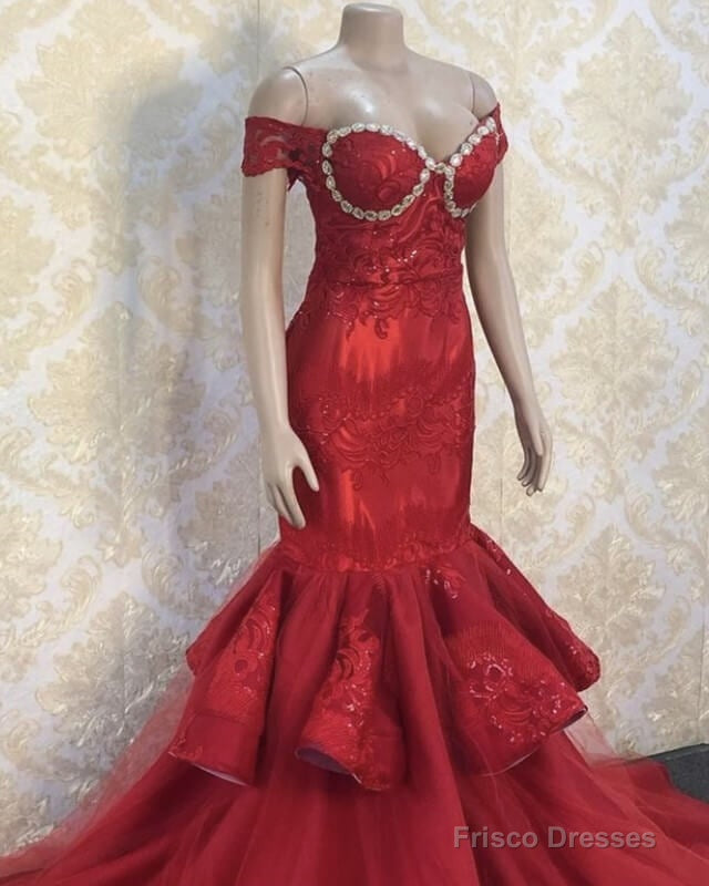 Red Mermaid Appliques Prom Dresses Off Shoulder