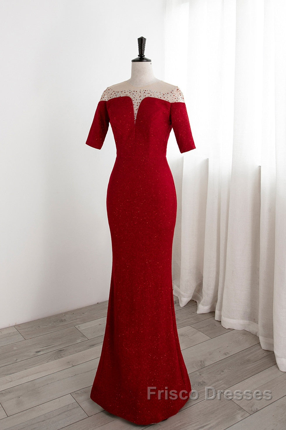 Red Mermaid Round Neckline Short Sleeves Party Dress, Red Evening Gown