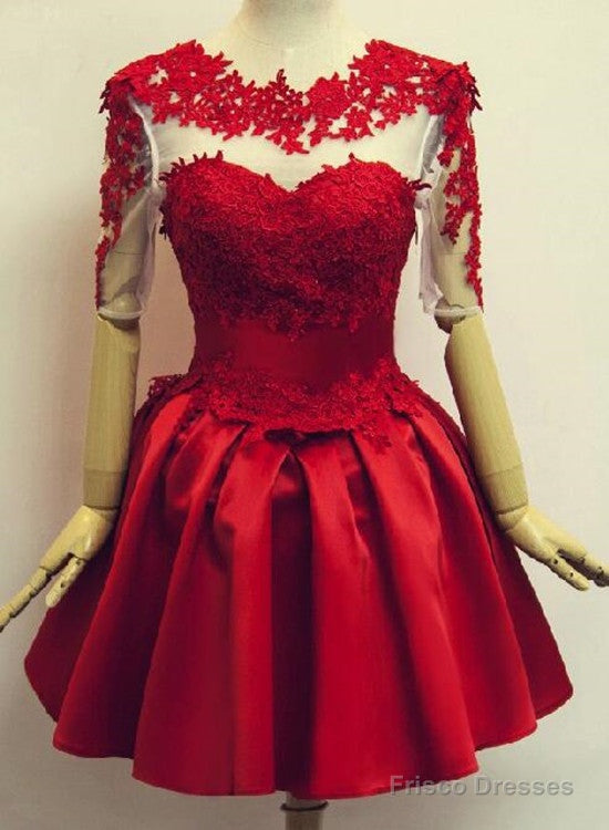 Red Short Sleeves Satin And Applique Homecoming Dresses, Red Short Prom Dresses, Formal Dress