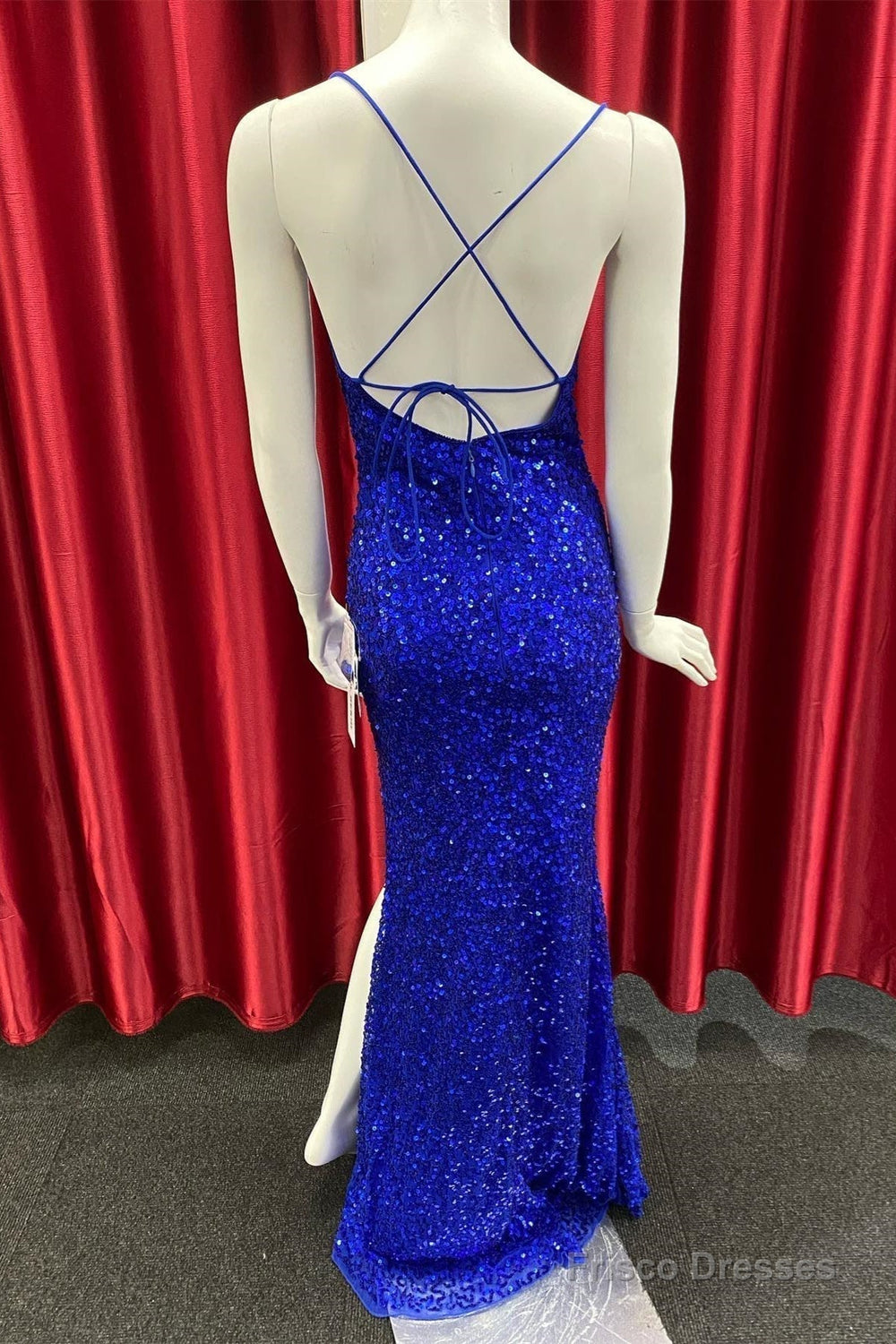 Royal Blue Lace-Up Sequins Mermaid Long Prom Dress with Slit