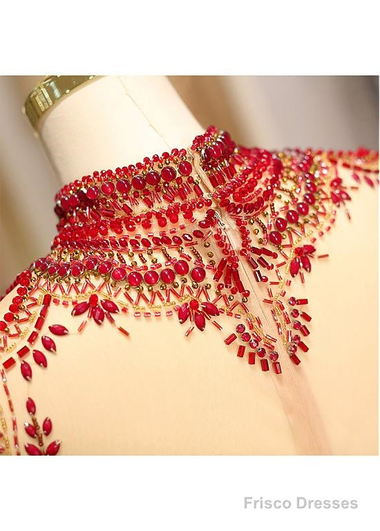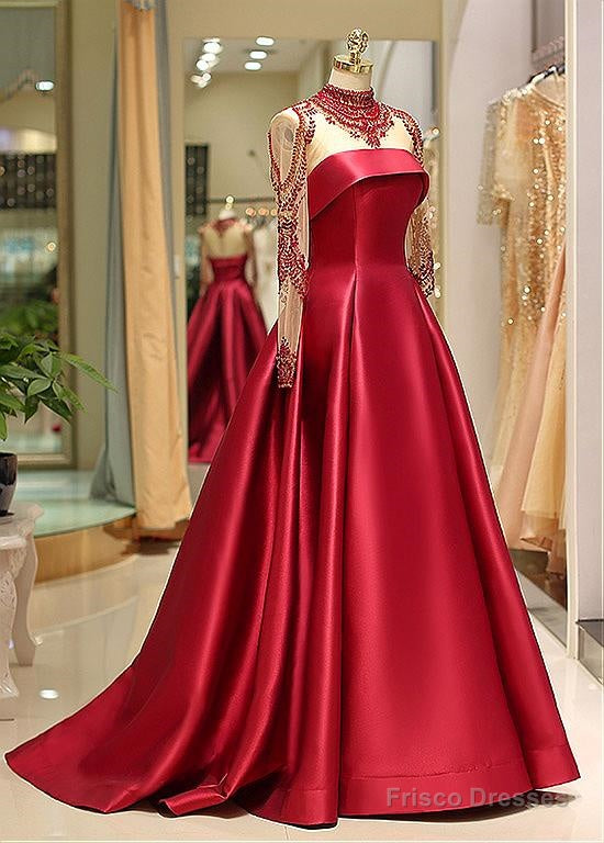Satin High Collar Long Sleeve Beading Prom Evening Dress