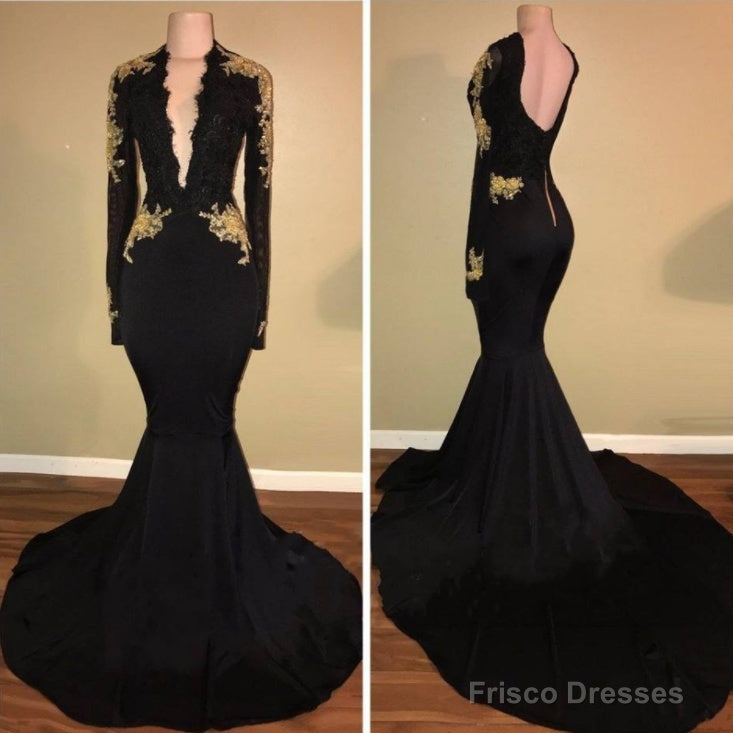 Sexy Deep V-Neck Long Sleeves Black Gold Prom Dresses