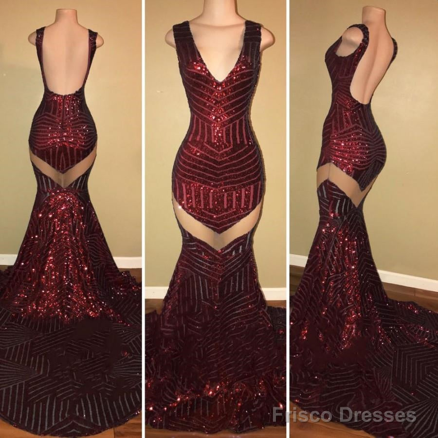 Sexy V-Neck Black Sequined Burgundy Prom Dresses
