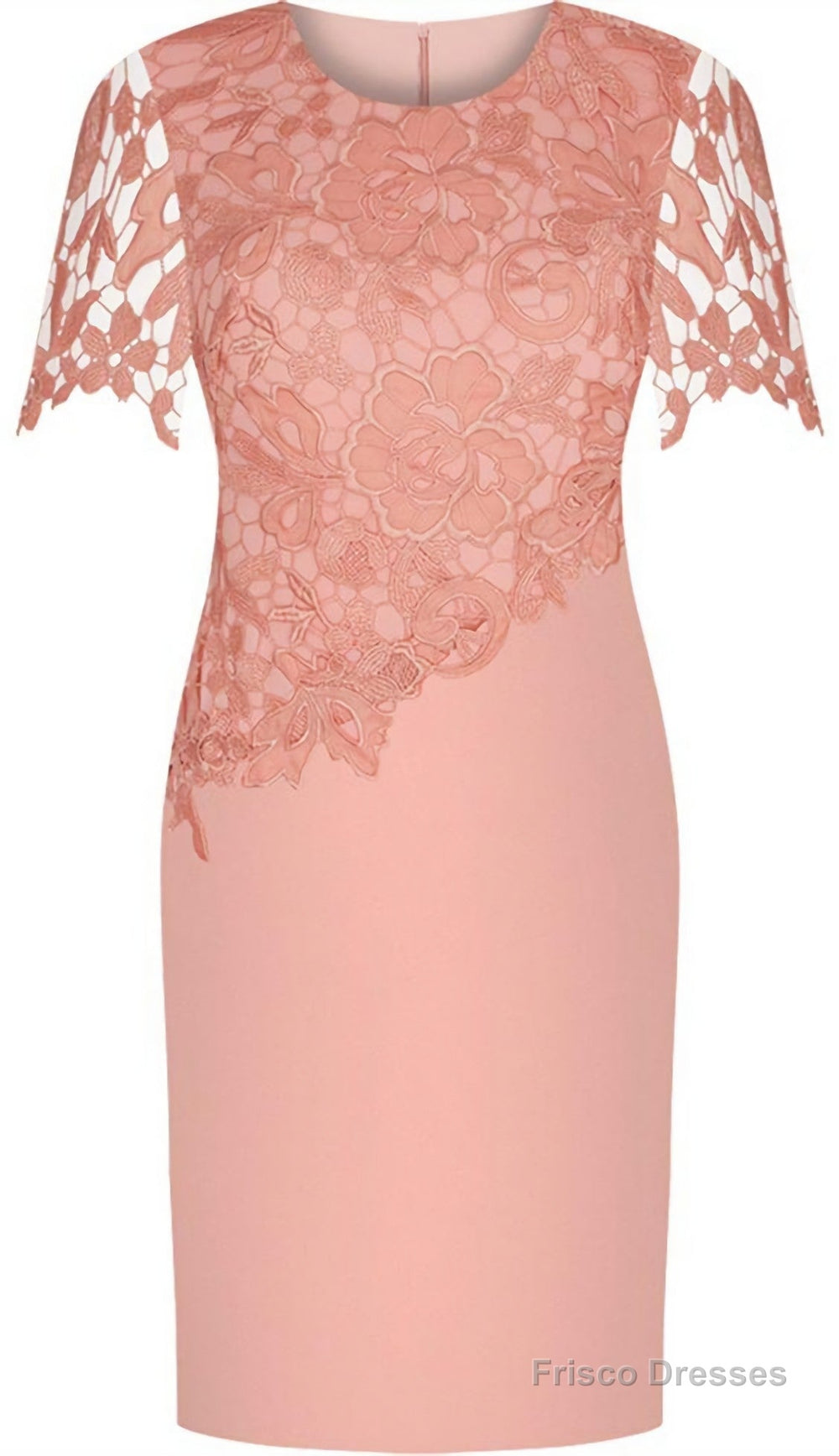 Sheath Round Neck Short Sleeves Prom Elastic Satin Short Mother Of The Bride Dress, With Lace