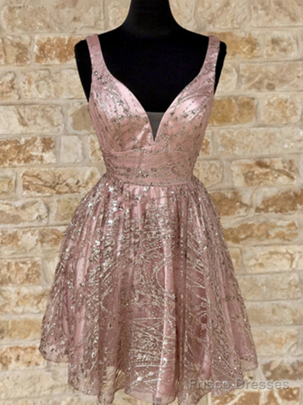 Shiny V Neck Short Champagne Prom Dresses, Short V Neck Champagne Graduation Formal Dresses