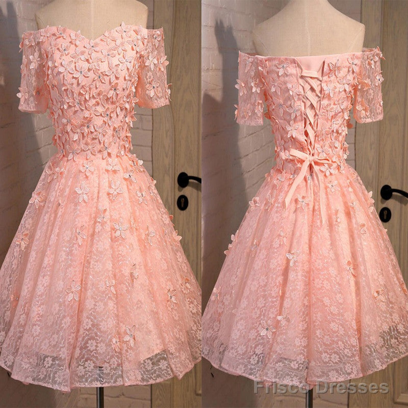 Short A-Line Junior Cute Off Shoulder Full Lace Appliques Beads Sweetheart Lace Up Back Homecoming Dress