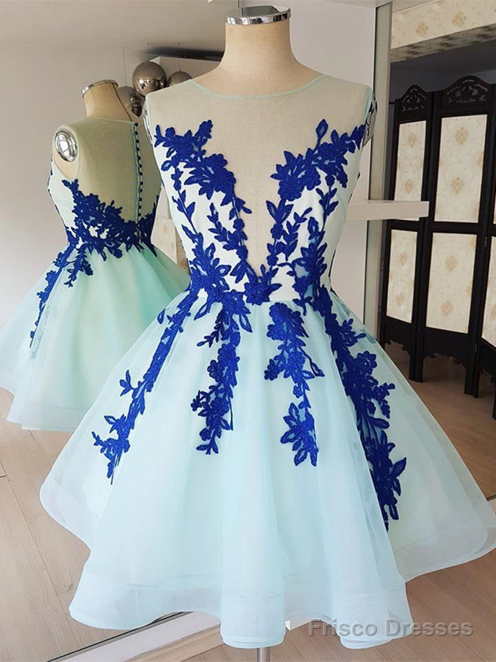 Short Blue Lace Tulle Prom Dresses, Short Blue Lace Homecoming Graduation Dresses