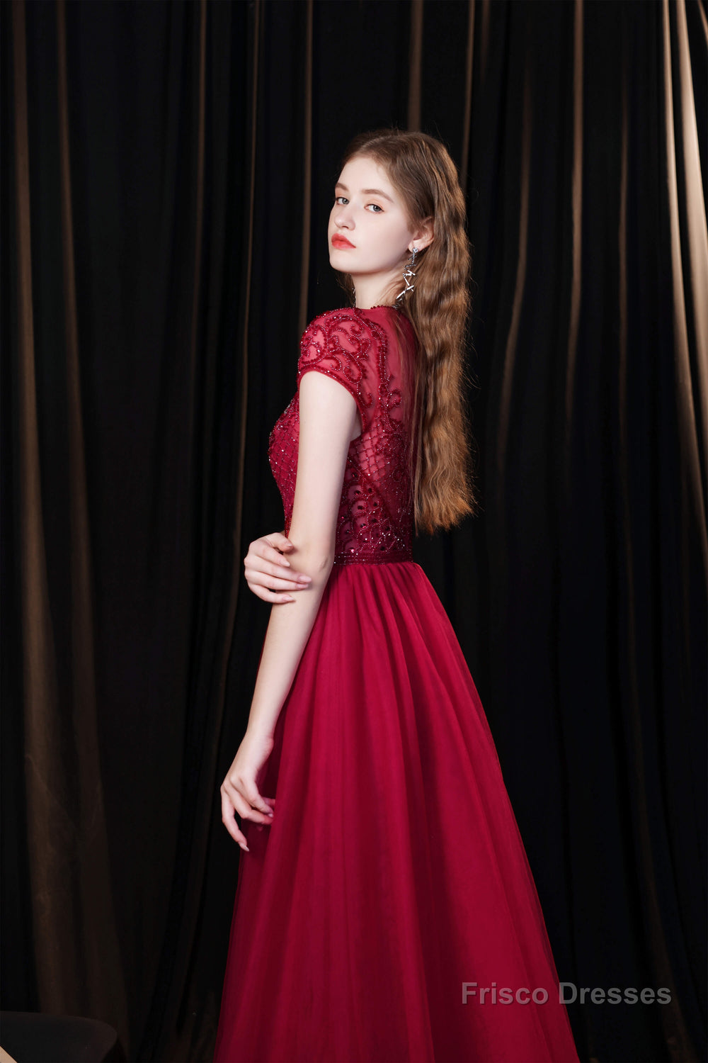 Short Sleeves High Neck Open Back Beading Long Prom Dresses