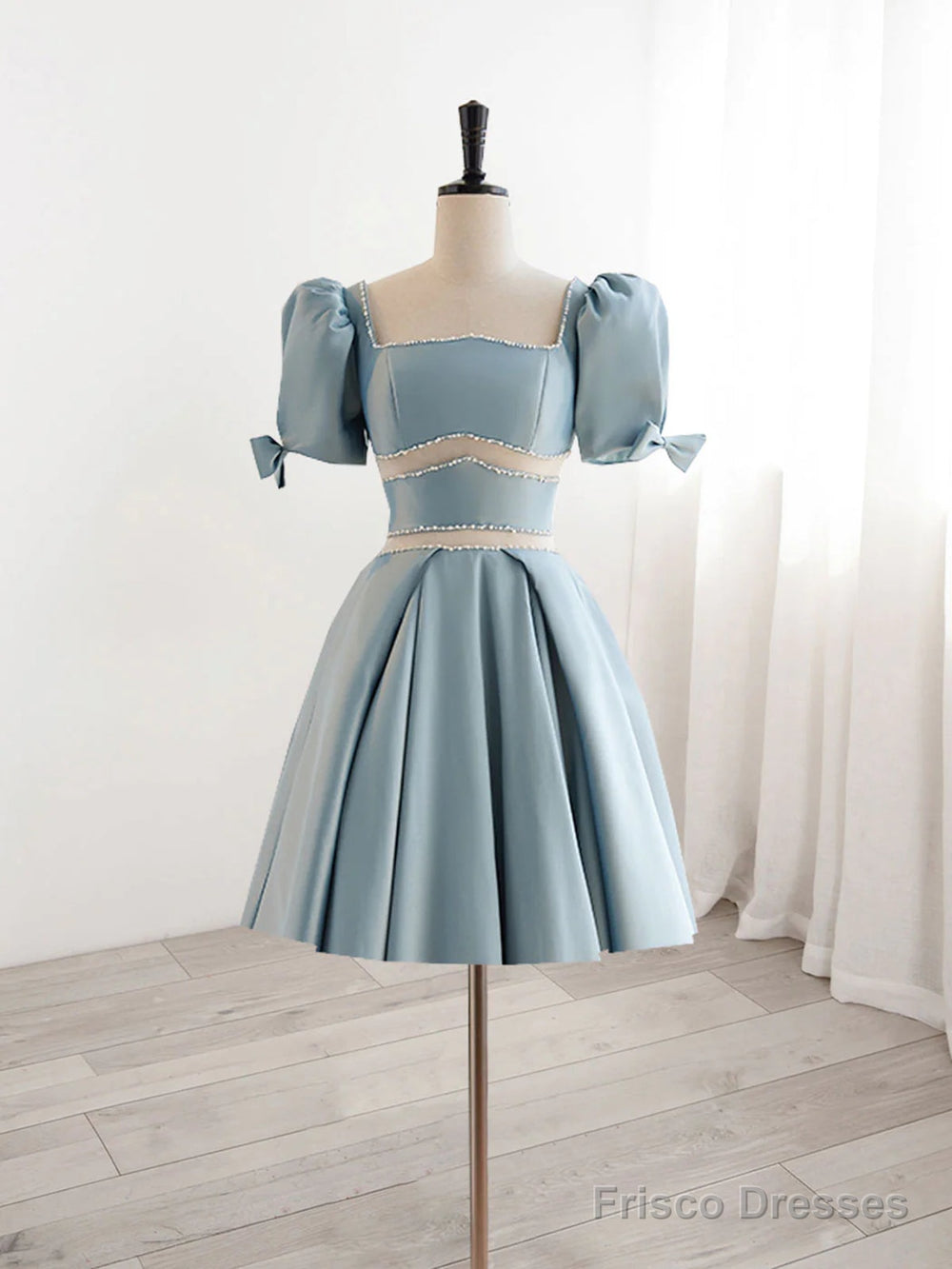 Short Sleeves Short Blue Prom Dresses, Short Blue Formal Homecoming Dresses
