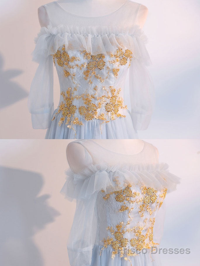 Simple Tulle Lace Gray Blue Prom Dresses, Tea Length Lace Bridesmaid Dresses