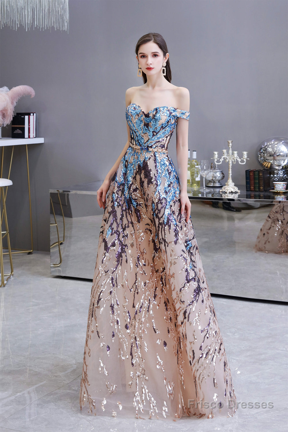 Sparkly Off-the-Shoulder Sequins A line Prom Dresses Floor Length