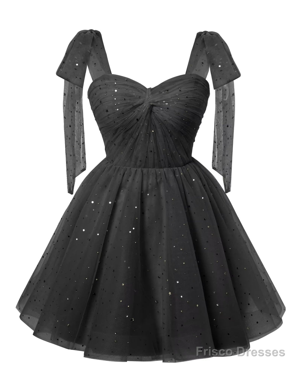Sparkly Starry Black Tulle Short Homecoming Dresses Spaghetti Bow Straps Prom Dress Sequin Cocktail Party Dress for Teens