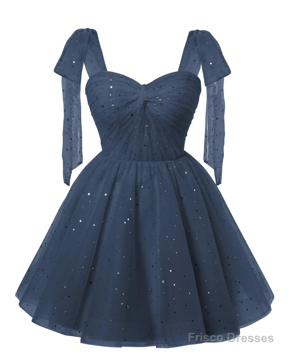 Sparkly Starry Navy Blue Tulle Short Homecoming Dresses Spaghetti Bow Straps Prom Dress Sequin Cocktail Party Dress for Teens