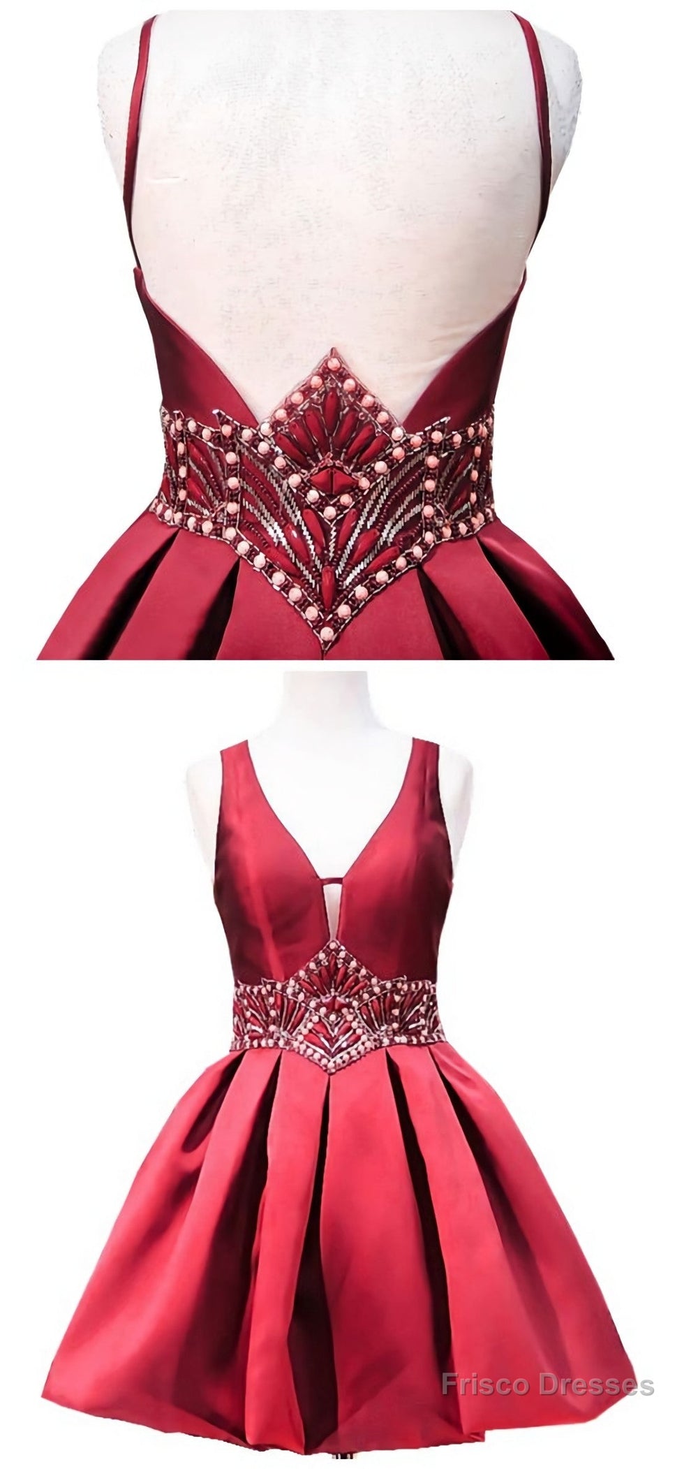 Sweet A Line V Neck Sheer Back Beaded Crystals 8Th Grade Prom Dresses, Short Burgundy Party Homecoming Dress, E0983