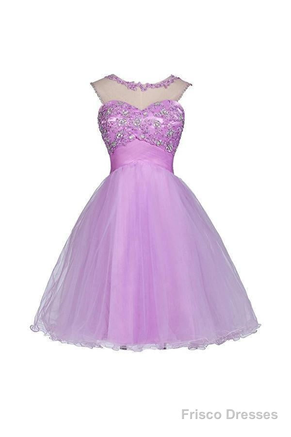 Tulle Appliques Beads Open Back Short Purple Homecoming Dresses