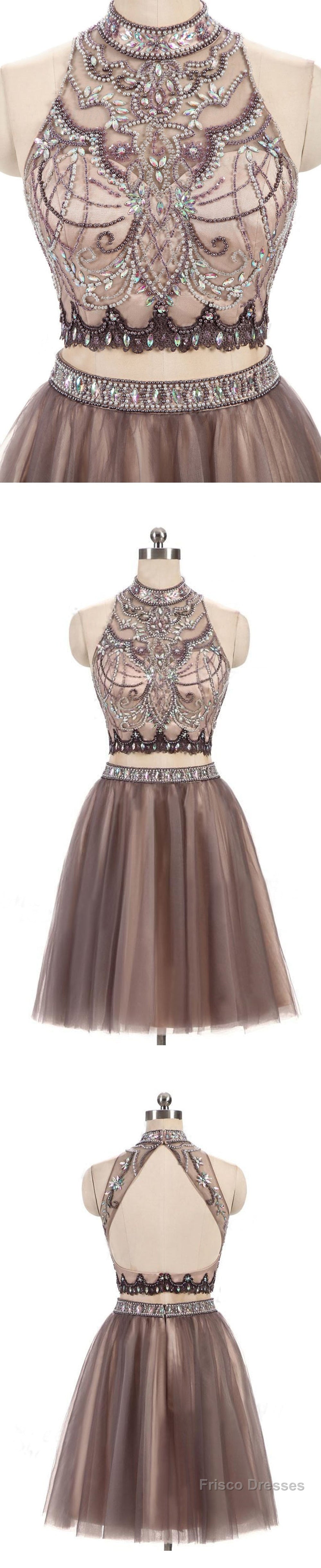 Two Pieces Gorgeous Beading High Neck Open Back Sleeveless Light Brown Homecoming Dresses