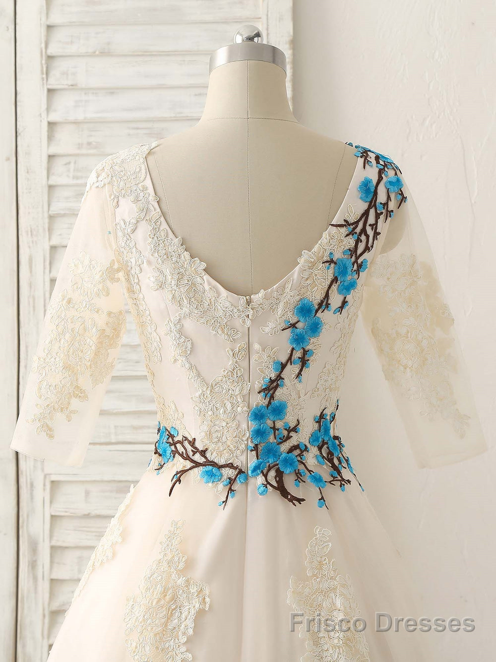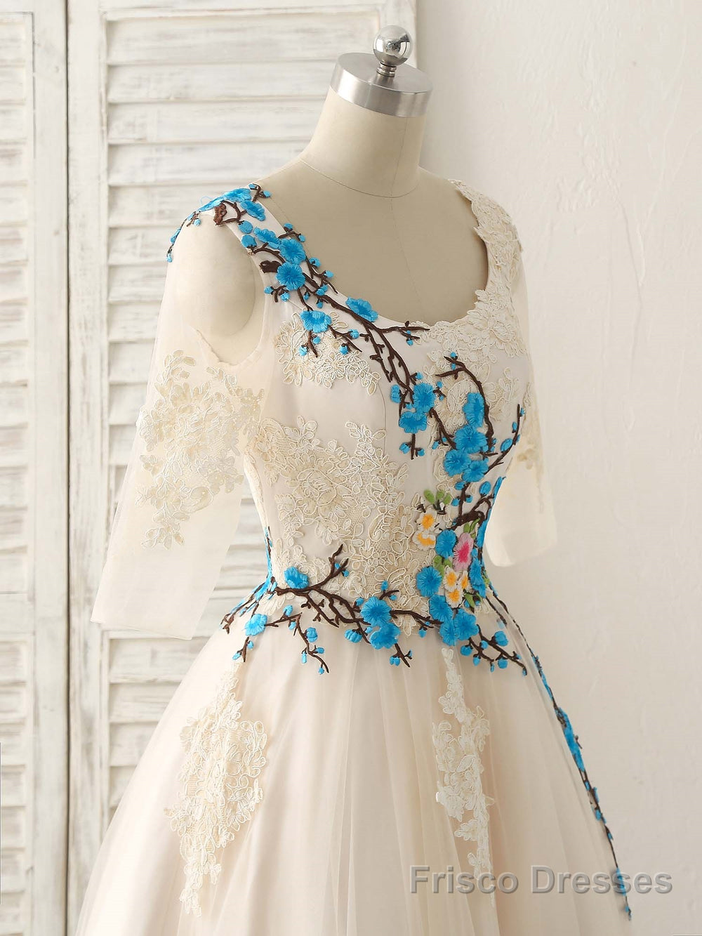Unique Lace Applique Tulle Long Prom Dress Light Champagne Bridesmaid Dress