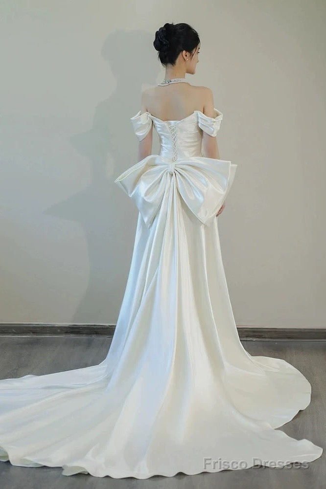 Unique Mermaid Off The Shoulder Pleats Short Sleeves Satin Wedding Dresses