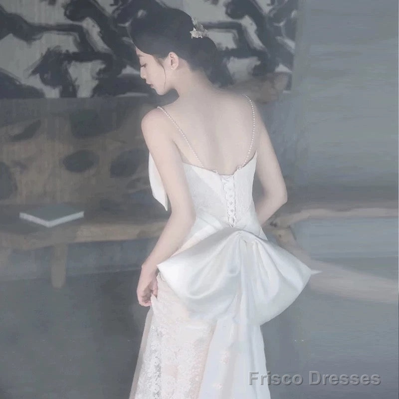 Unique Mermaid Spaghetti Straps Lace Pleats White Ruffles Wedding Dresses