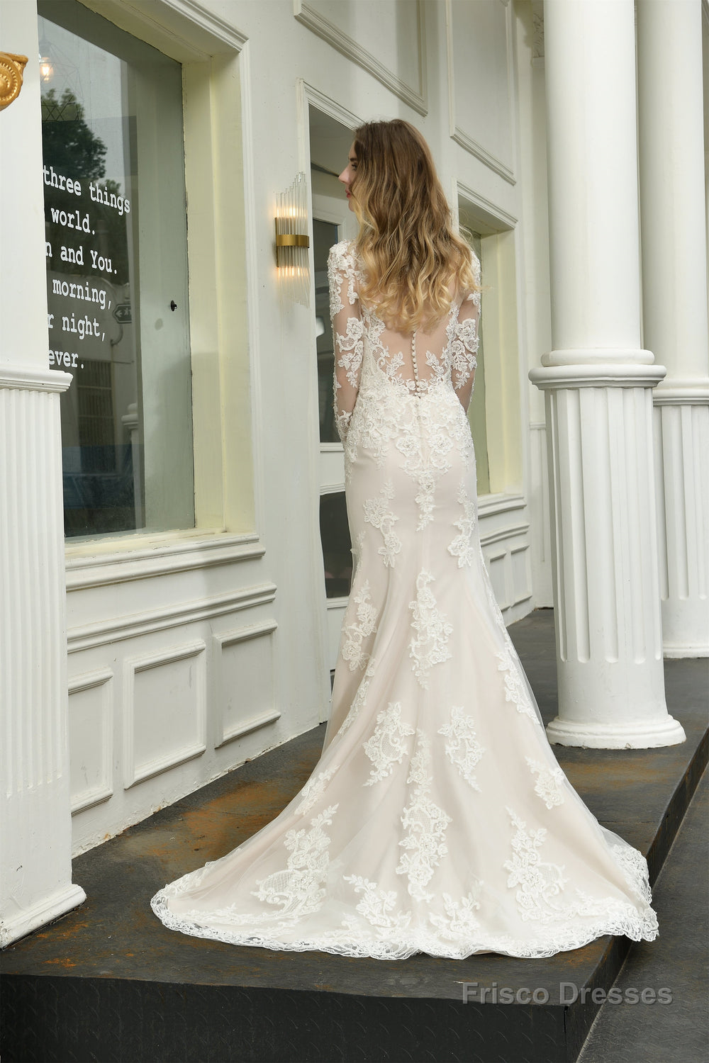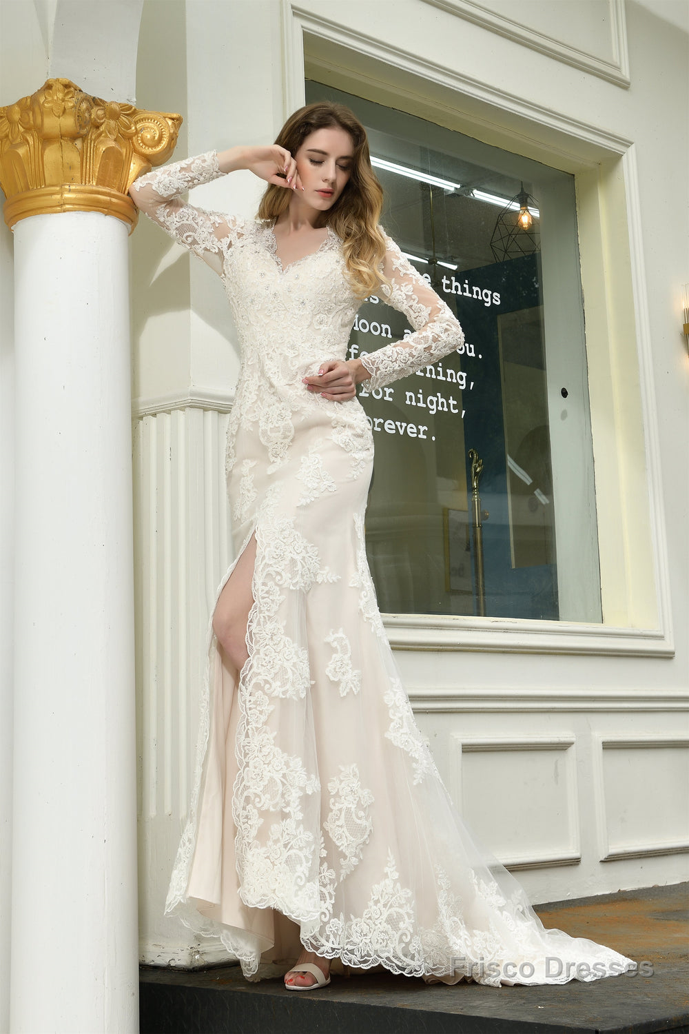 V-Neck High Split Long Sleeves Lace Wedding Dresses With Court Train
