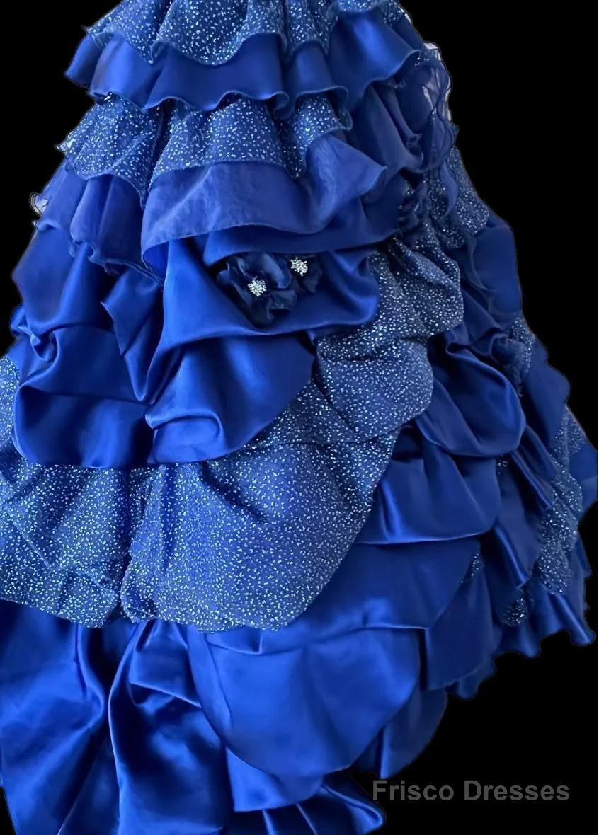 Vintage A-Line Strapless Satin Tulle Long Ball Dress Klein Blue 3D Applique Evening Dress