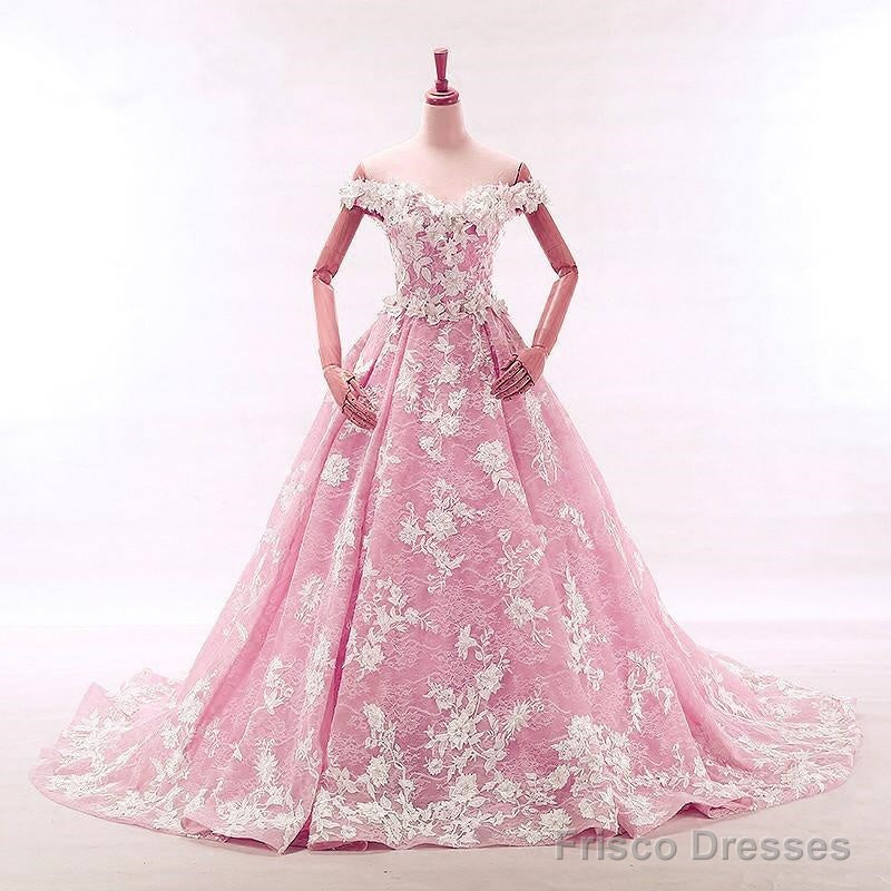 Vintage Lace Appliques Off Shoulder Pink Lace Wedding Dress Ball Gowns