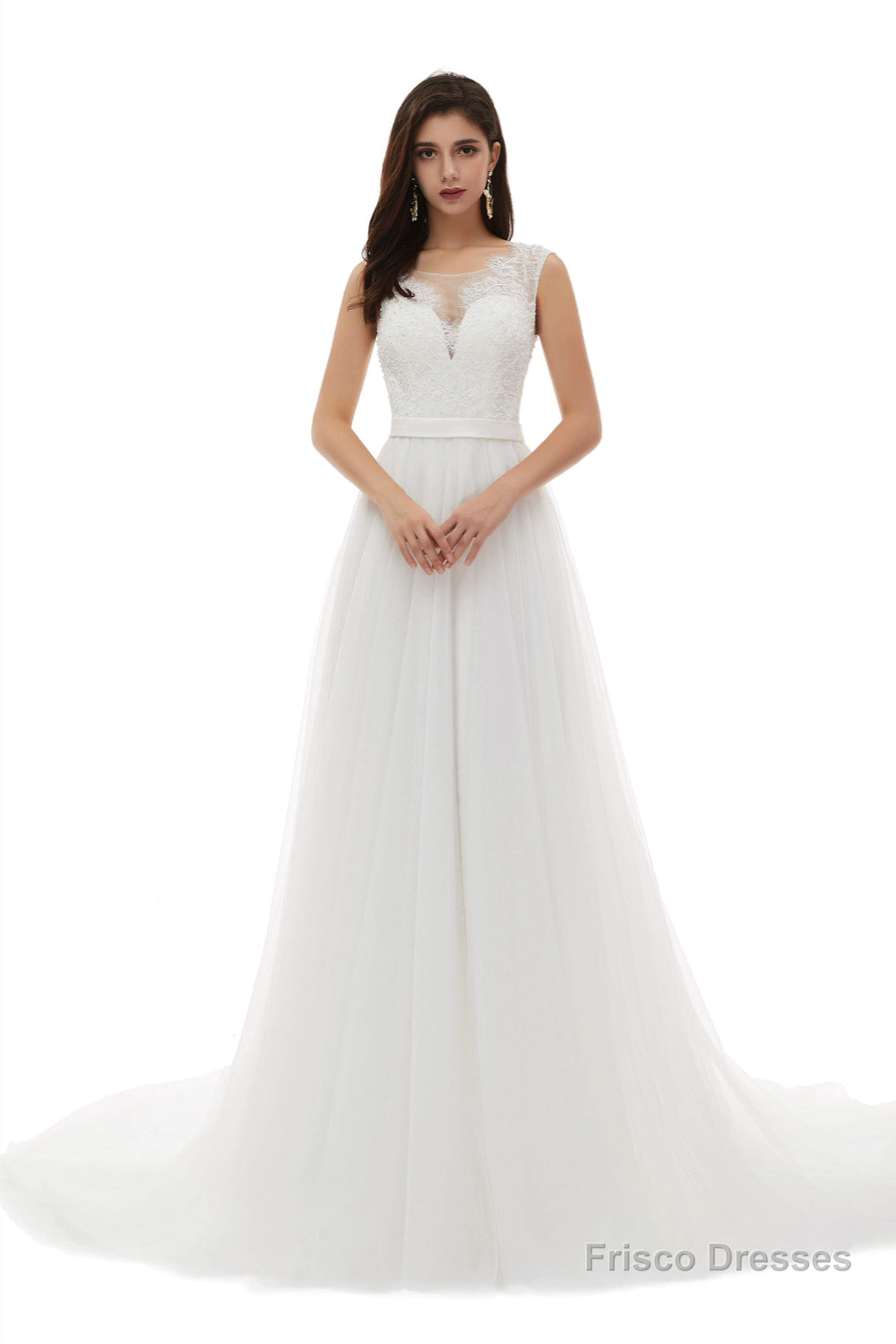 White Tulle Scoop Neck Lace Appliques Beading Wedding Dresses
