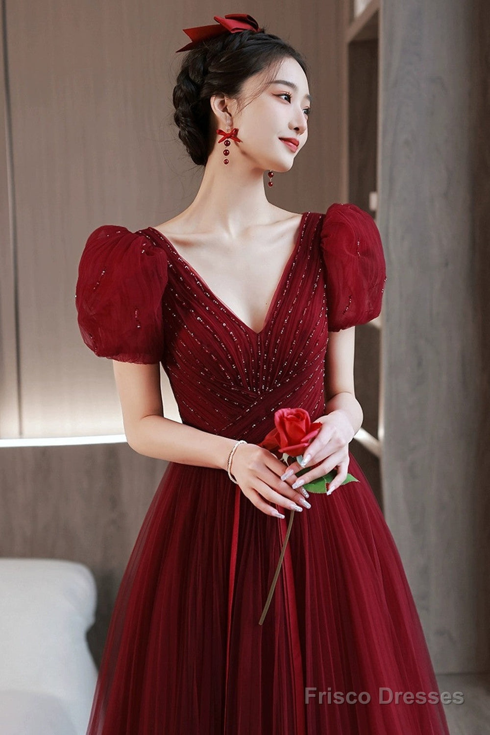Wine Red Beaded Short Sleeves Tulle Party Dress, Wine Red A-Line Long Prom Dress