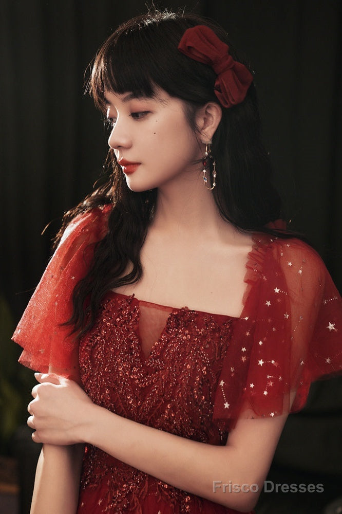 Wine Red Short Sleeves Tulle With Lace Long Party Dress, Wine Red Prom Dress