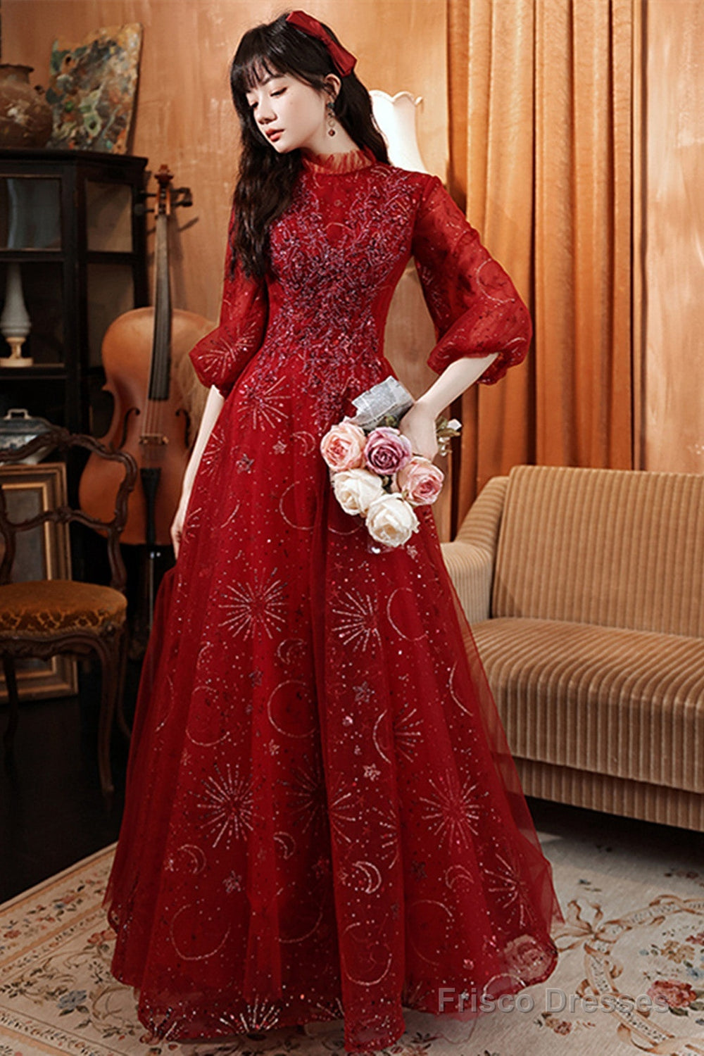 Wine Red Tulle Puffy Sleeves Long Party Dress, Wine Red Long Prom Dress