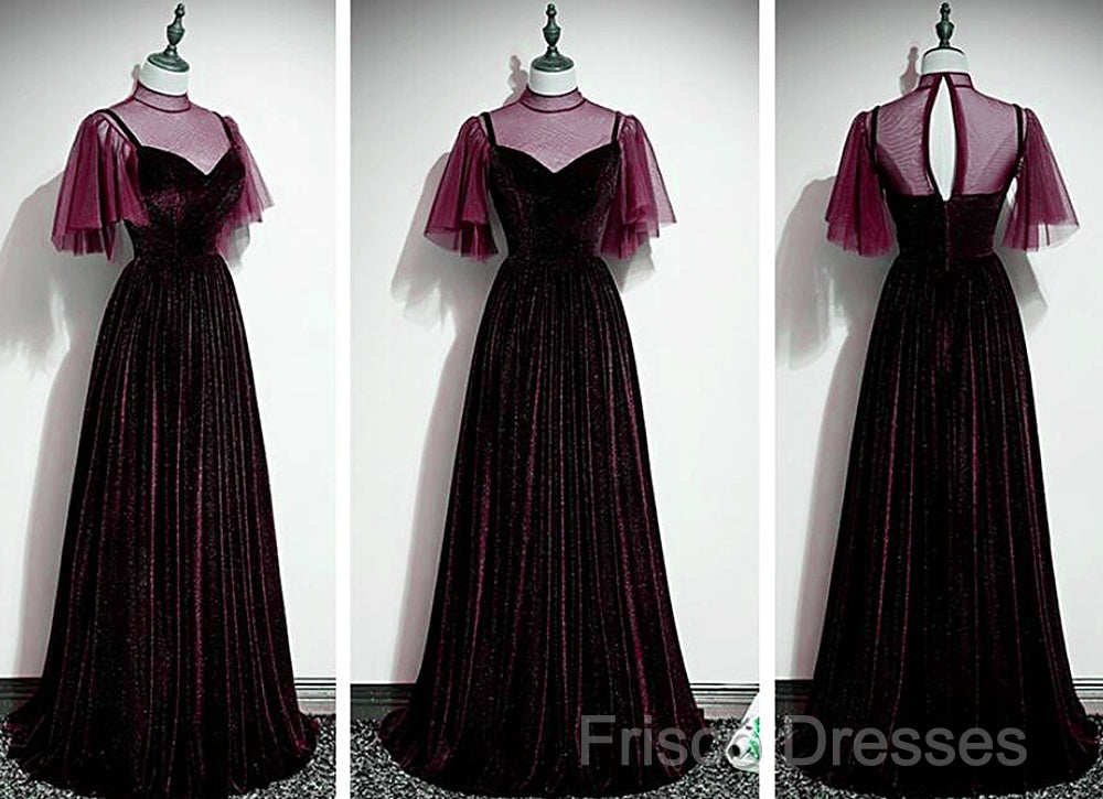 Wine Red Velvet A-Line Long High Neckline Party Dress, Wine Red Long Bridesmaid Dress