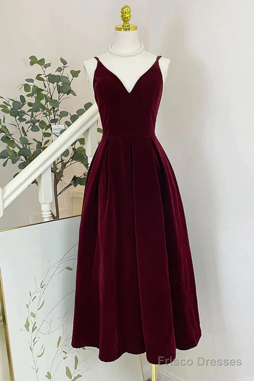 Wine Red Velvet Tea Length Homecoming Dress, Wine Red V-Neckline Party Dress